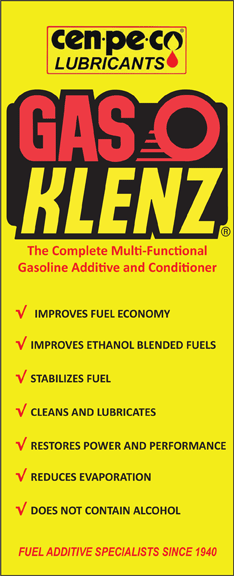 Cen-Pe-Co Gas-O-Klenz, a multifunctional additive to be used in all grades of gasoline and ethanol blends. Gas-O-Klenz may be added to bulk storage tanks or directly to your fuel tank as it is self-mixing and will not settle out. For maximum results, Gas-O-Klenz should be added each time your tank is refilled. Gas-O-Klenz excels at keeping ethanol fuel mixtures fresh during storage. Gas-O-Klenz cleans not only the intake and injectors, but combustion chamber and exhaust port deposits as well.