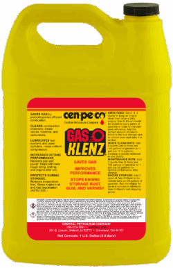 Injector cleaners are cheap and easy to find. Unfortunately, they leave deposits elsewhere in the engine. Intake valve deposit additives are harder to come by, and still leave deposits in combustion chambers. Combustion chamber deposit cleaners are the best gasoline additives, because they do the whole job of cleaning from injectors to combustion chambers. Cen-Pe-Co Gas-O-Klenz removes combustion chamber deposits, allowing the engine to operate more efficiently for better fuel economy. Gasoline degrades during periods of storage. If left in seasonal equipment, it can form gums and create operability problems. Degraded fuels are prone to forming deposits, so burning them can cause engine operability problems that last long after fresh gasoline is added. Cen-Pe-Co Gas-O-Klenz stabilizes gasoline in storage and in seasonal equipment.