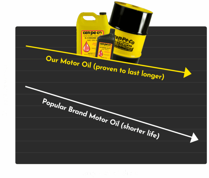 Because of Cen-Pe-Co’s superior base oil, shear stable polymers, and extra robust additive package; Cen-Pe-Co oil can be run longer without any sacrifice in wear or performance. Unlike other oils, our oil maintains efficiency throughout the entire oil drain interval.