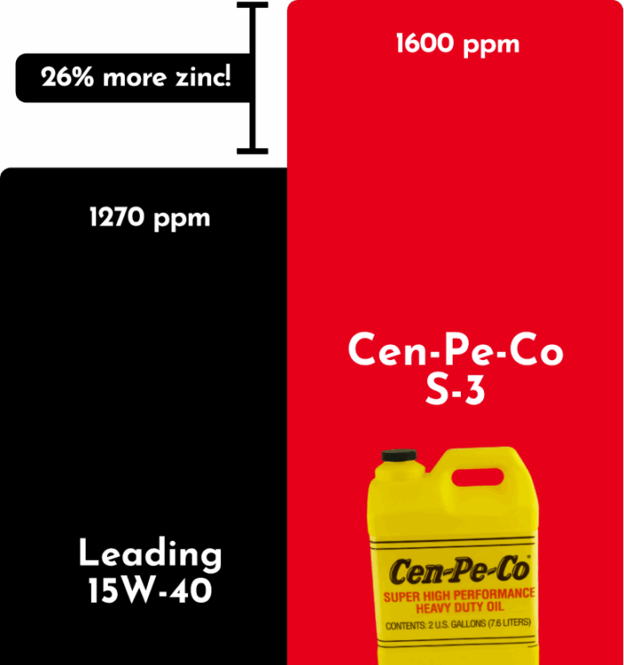 While most manufacturers have cut back on the amount of zinc in their oil formations, Cen-Pe-Co has added extra, high-quality zinc compounds. This extra zinc protects and reduces wear, inhibits oil oxidation (breakdown), and reduces rust formation during downtime and storage.